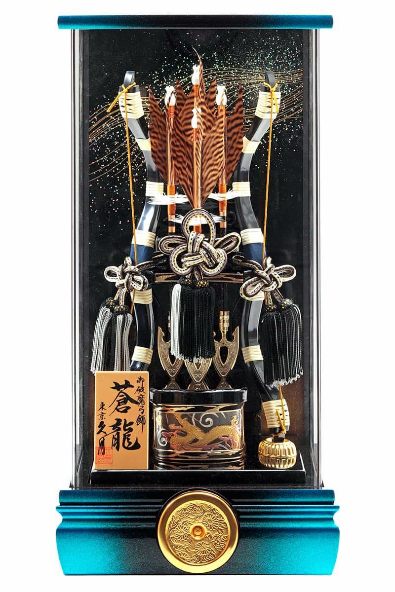 青黒のぼかしケースが印象的な破魔弓飾りです。