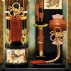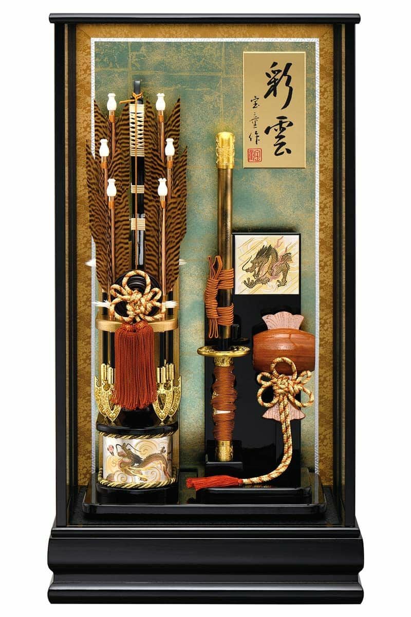 脇には太刀と打ち出の小槌もセットされ、豪華な仕上がりとなっております。打ち出の小槌は、振れば振るほど幸福をもたらすとされ、お祝いに相応しい縁起の良いモチーフです。