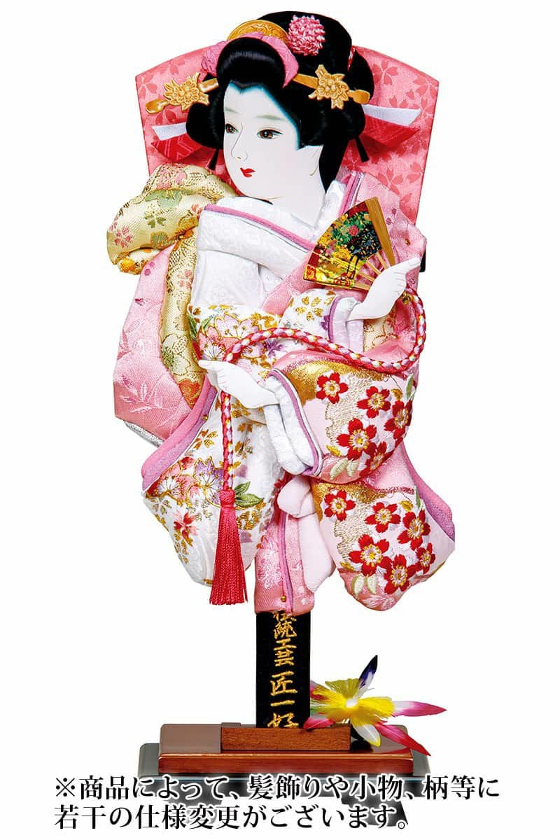 また、同一材料を使用しておりますが、各サイズに一番合ったバランスで製作しているため、縮尺やお顔の向き、細部(かんざし・帯など)の仕様が若干変わる場合がありますので、予めご了承ください。