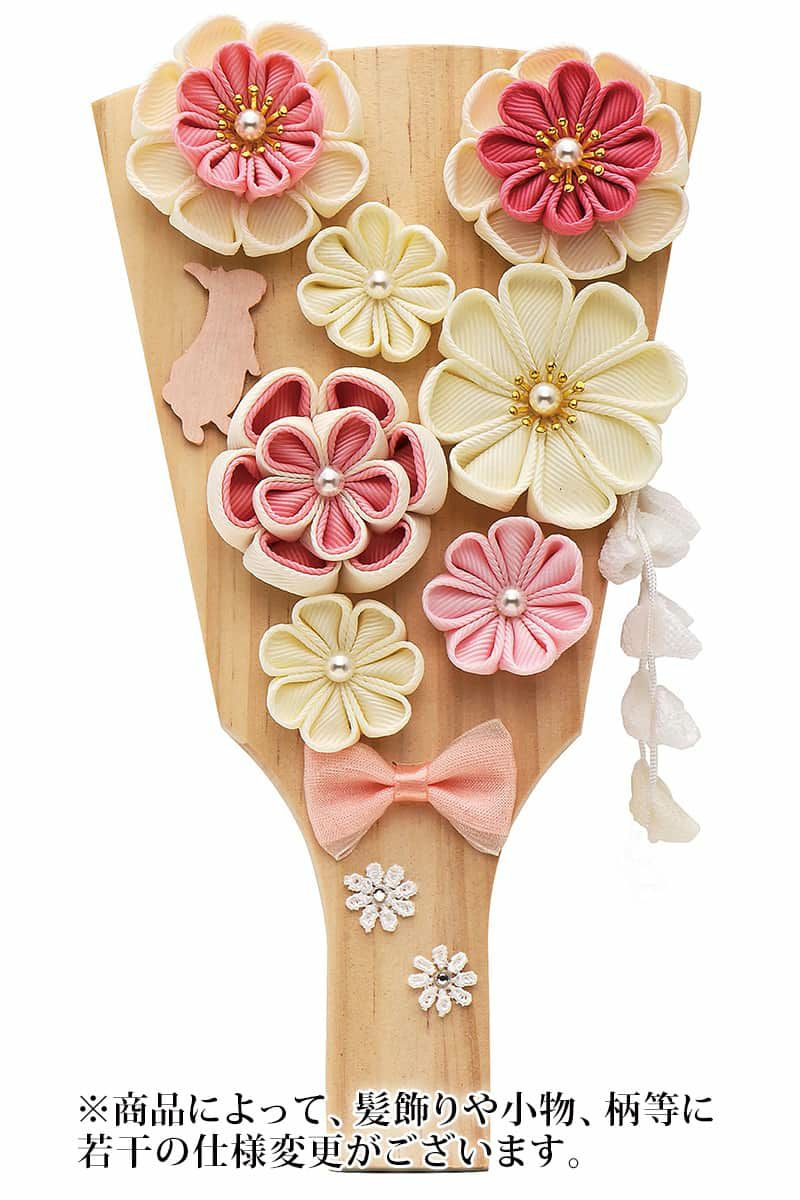 ナチュラルな白木に、つまみ細工の可愛らしいお花飾りをたっぷりとあしらった、羽子板単品飾りです。