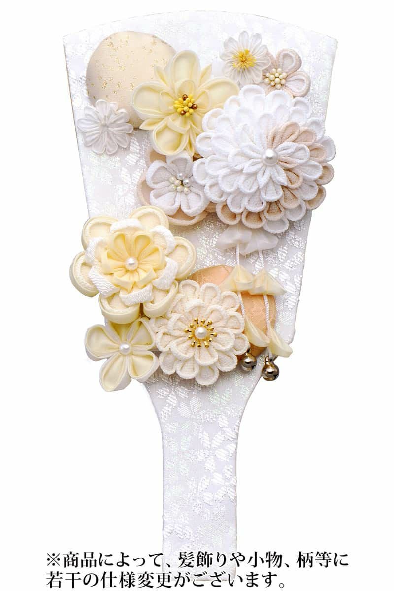 丁寧に仕立てられたつまみ細工のお花に、円満を意味する鞠、魔除けの鈴が添えられています。