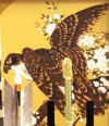 雄々しく羽根を広げ、まさに飛び立たんとする力強い鷹の姿が印象的な破魔弓ケース飾りです。