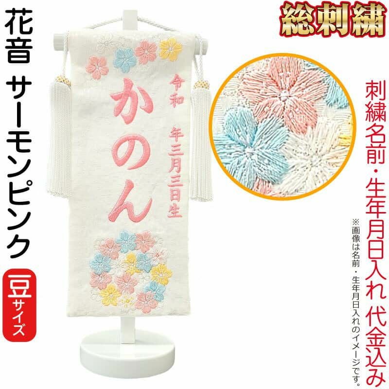 【送料無料】最安値に挑戦!2026年度新作 雛人形 雛人形 ひな人形 名前旗 女の子 総刺繍 花音(豆)サーモンピンク刺繍 生年月日 名前入代込 白塗スタンド付 【2026年度新作】 3ad-kanon-mame-p