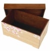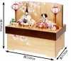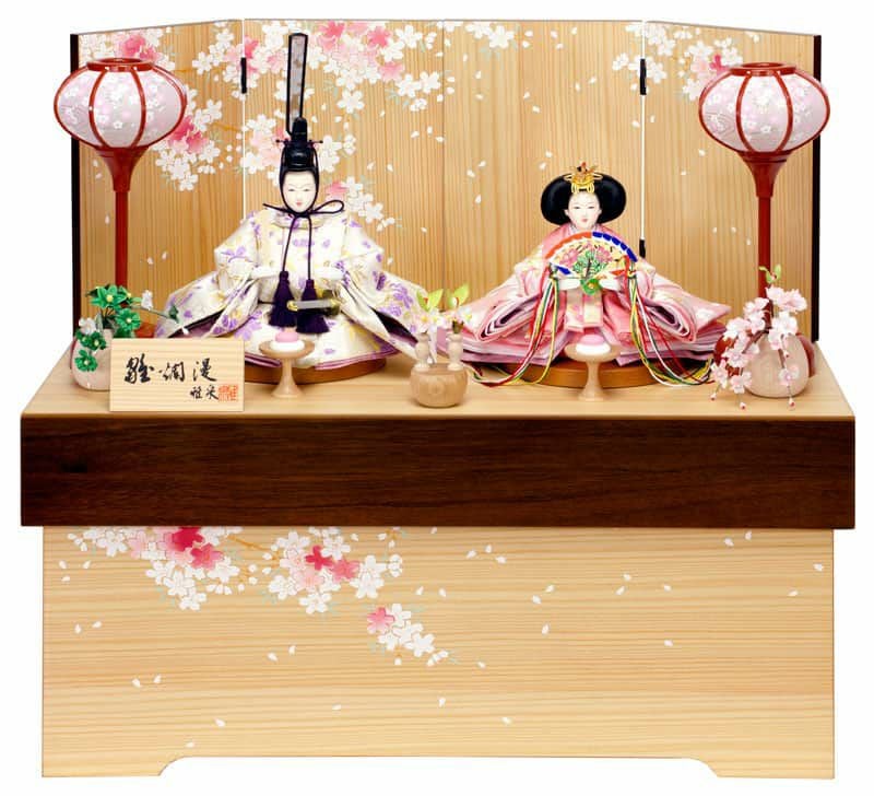 白木の明るい質感を活かした飾り台と屏風には、満開の桜が描かれ、おめでたい雰囲気あふれる仕上がりに。飾り台は、収納箱としてもお使いいただけ、お節句後には、お人形やお道具をしまう事ができ機能性にも優れています。