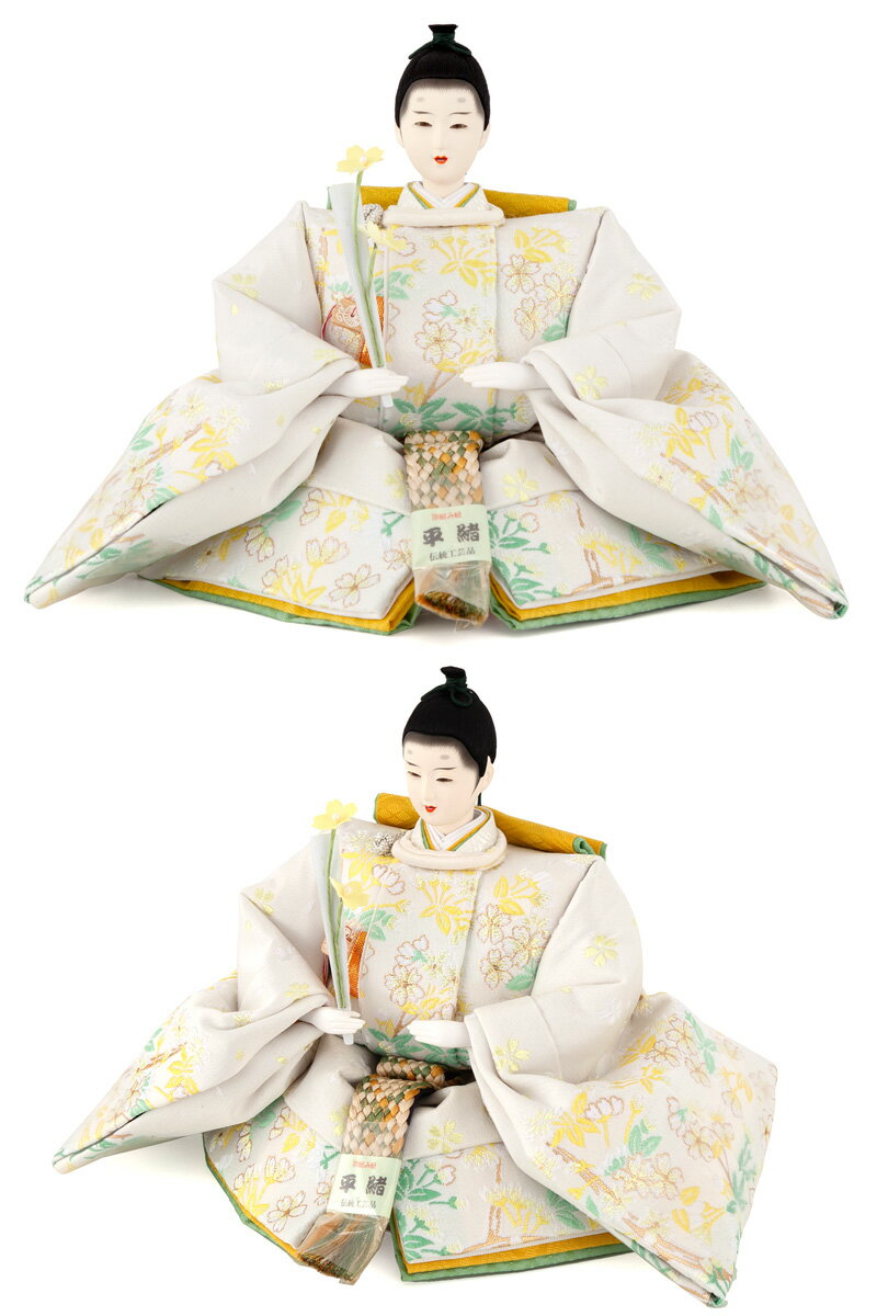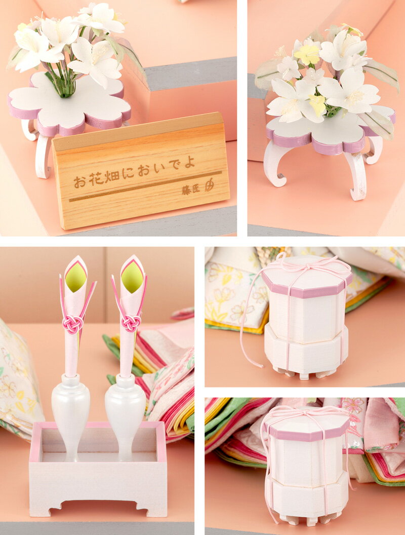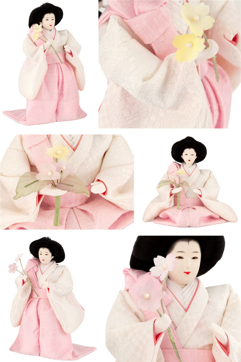 三人官女の淡い春色も負けじと美しく、お道具の変わりにお花を手にしており、かわいらしさ満点ですね。