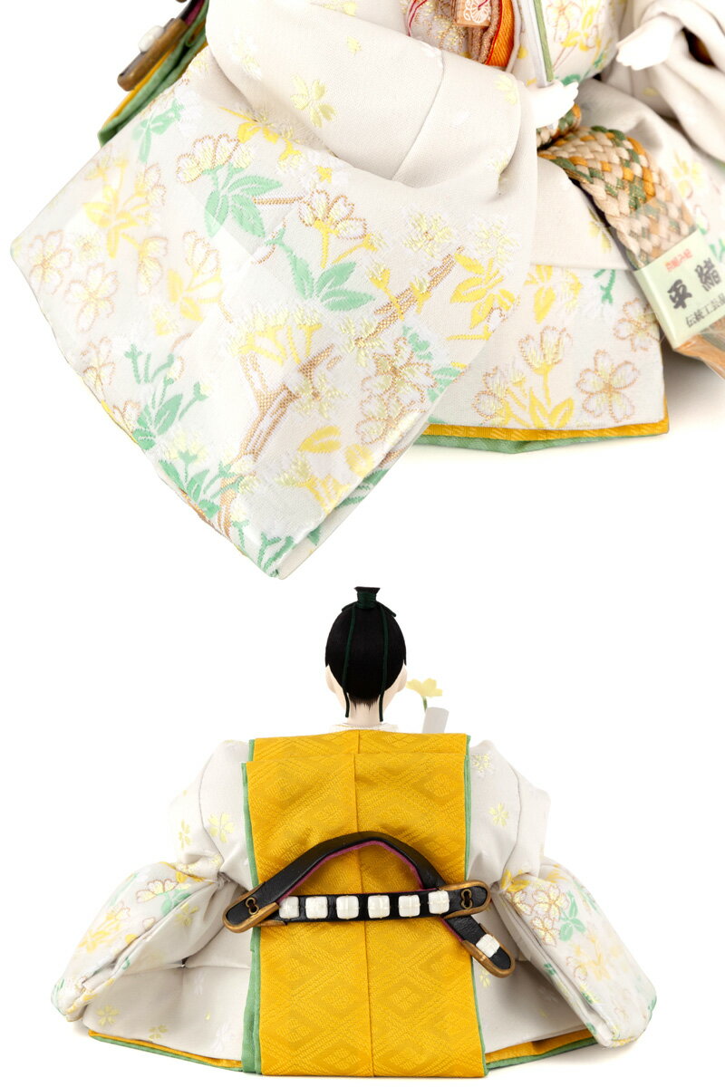 お殿さまは黄色と緑をポイントに、軽やかで心弾むような衣裳の文様で、お雛さまも、淡い色彩の中に色鮮やかなピンクや黄、緑といった、春のお花畑をのぞきこんだかのような色調の衣裳をまといました。