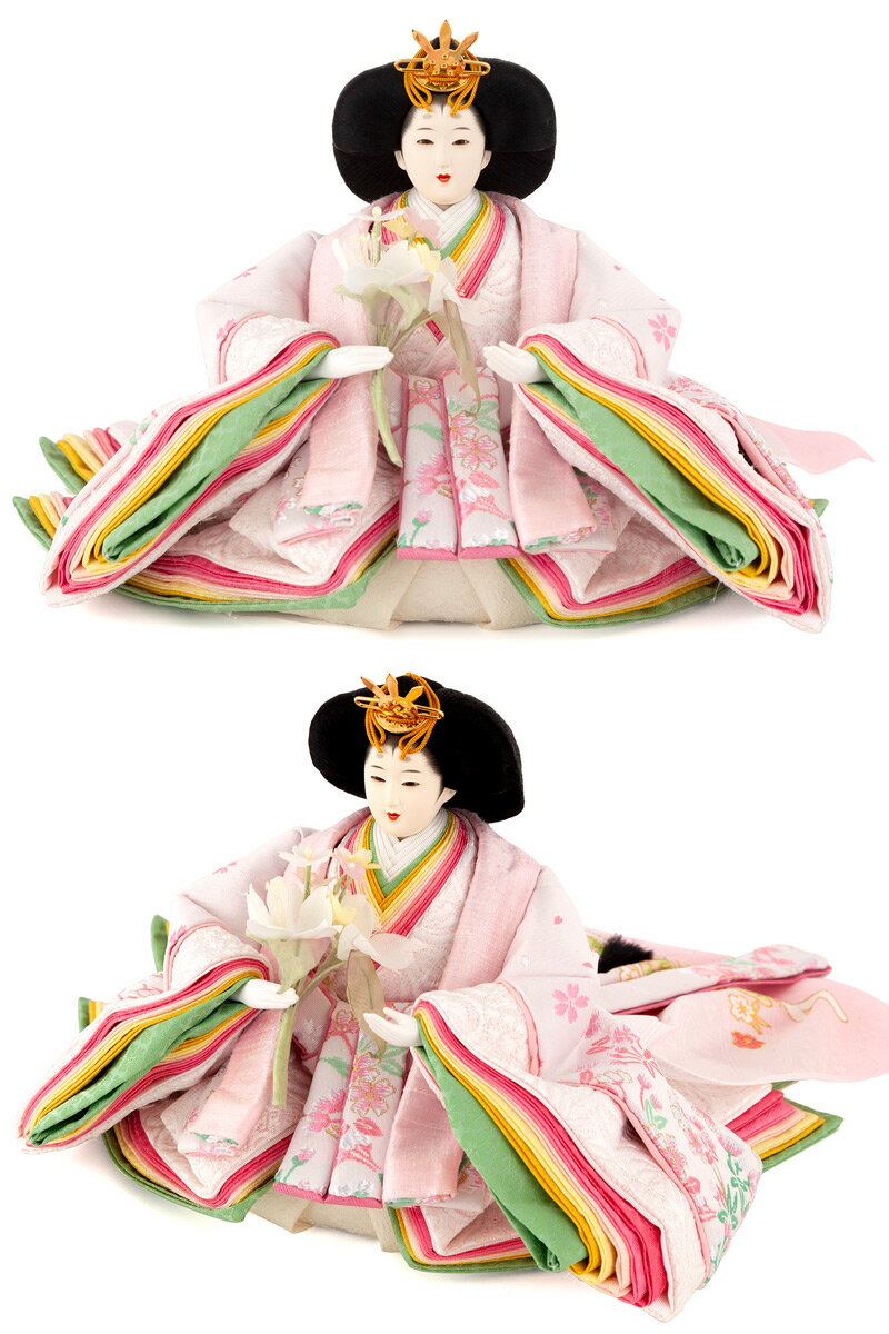 あえてすっきりと余分な装飾を省いた世界の中に、衣裳から飾り台、小物まで、春の象徴「桜」を思わせるピンク色でまとめた色彩が、愛らしさいっぱいにあふれたお雛飾りです。