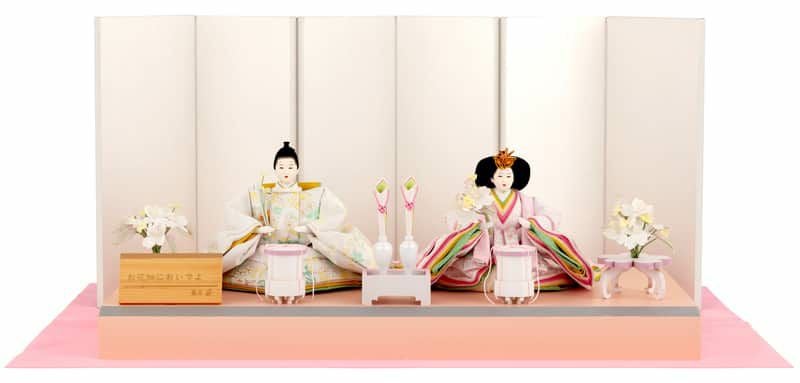 あえてすっきりと余分な装飾を省いた世界の中に、衣裳から飾り台、小物まで、春の象徴「桜」を思わせるピンク色でまとめた、愛らしさいっぱいにあふれたお雛飾りです。
