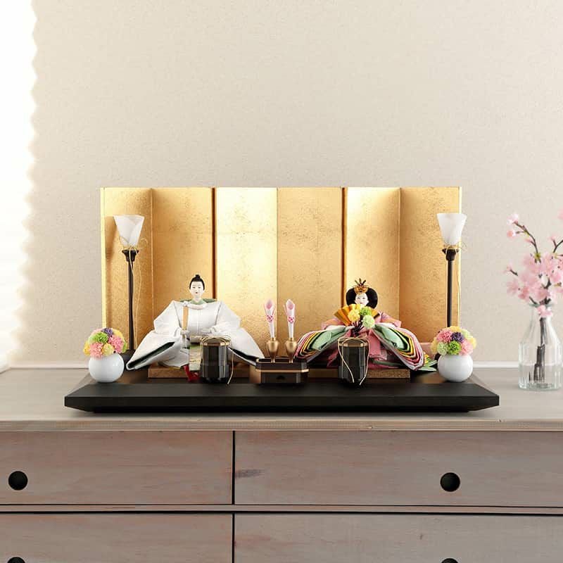 木目の美しい重厚な飾り台に、きらびやかな金屏風を合わせた気品あふれる親王飾りのご紹介です。