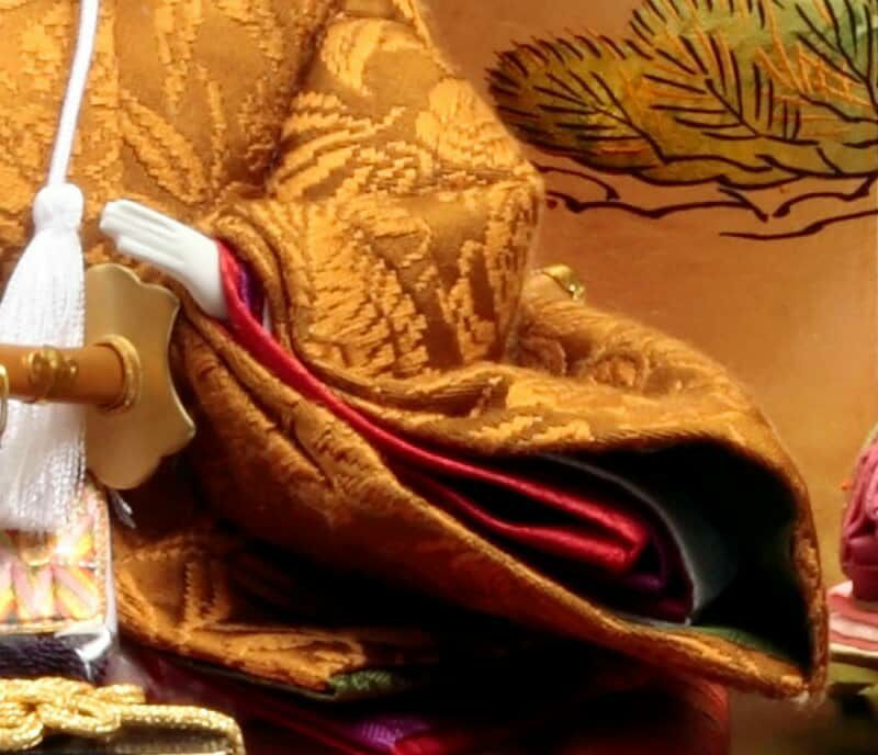 お殿様の纏う黄櫨染は、天皇陛下のみが着用を許された格式高い衣裳となっており、古典的な美しさを感じさせます。