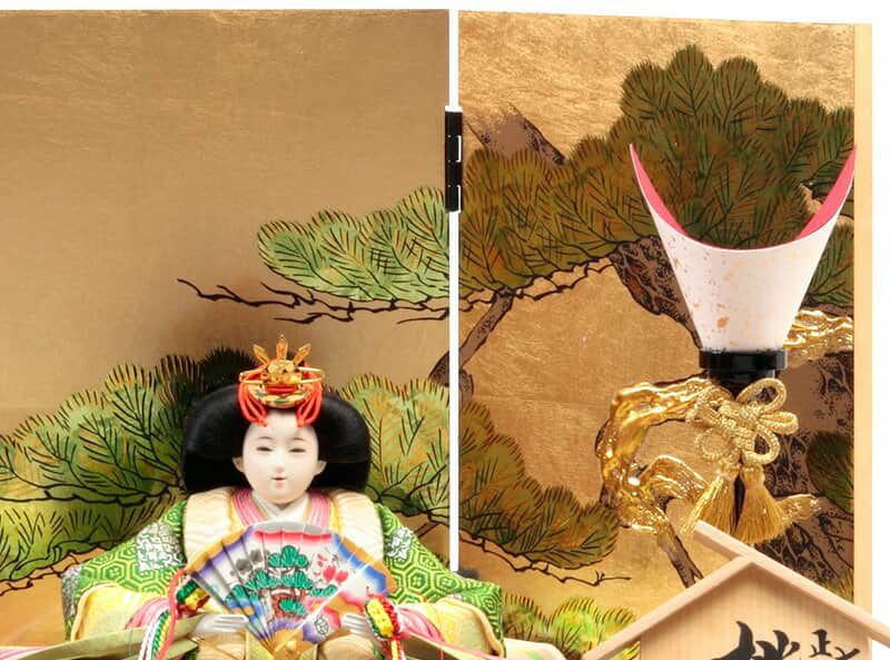 収納箱としてもお使いいただける飾り台と気品あふれる金屏風には、長寿の象徴とされる老松の図案を描きました。
