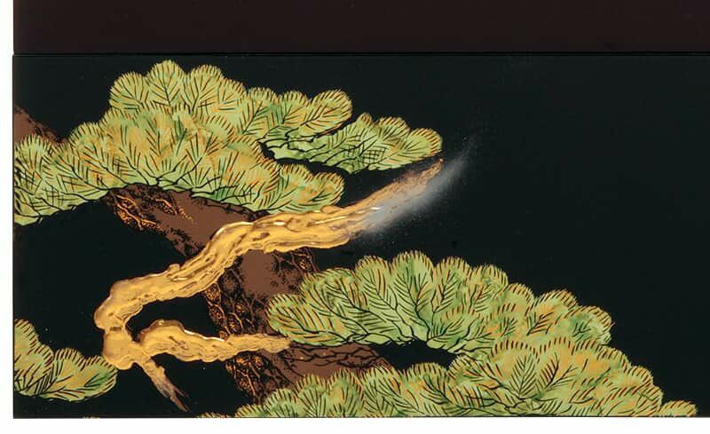 幹の部分にあしらわれた盛上げ加工は、一筆一筆職人によって仕上げられており、力強い松の生命力を見事に表現しています。