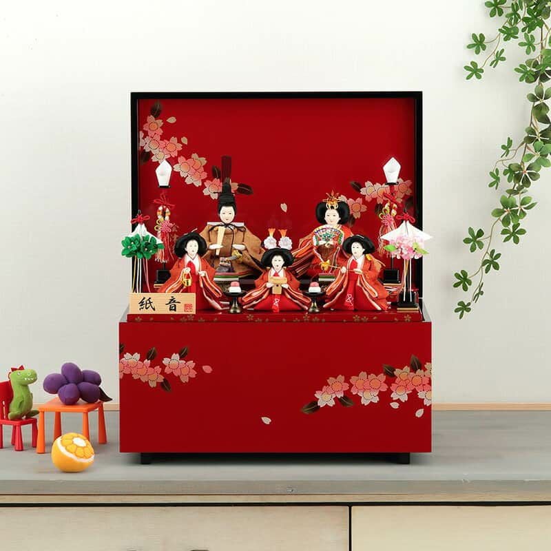 可愛らしい桜の花が咲いた飾り台にはお人形たちを収納することができます。