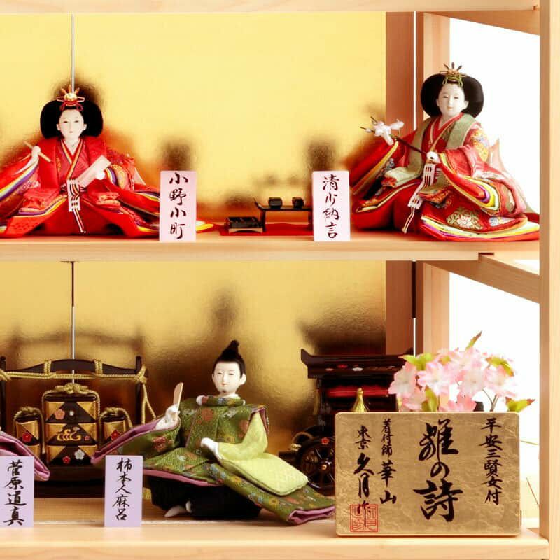 優しく微笑む親王と、小野小町・清少納言・紫式部に、王朝時代の才知に優れた歌人、柿本人麻呂・菅原道真の二人を加え、お子様の将来へ願いを込めた一式となりました。