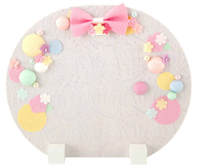背景の衝立屏風には、キラキラのレース地に立体的なリボン、桜、ボタン、パールビーズなどの装飾をちりばめました。