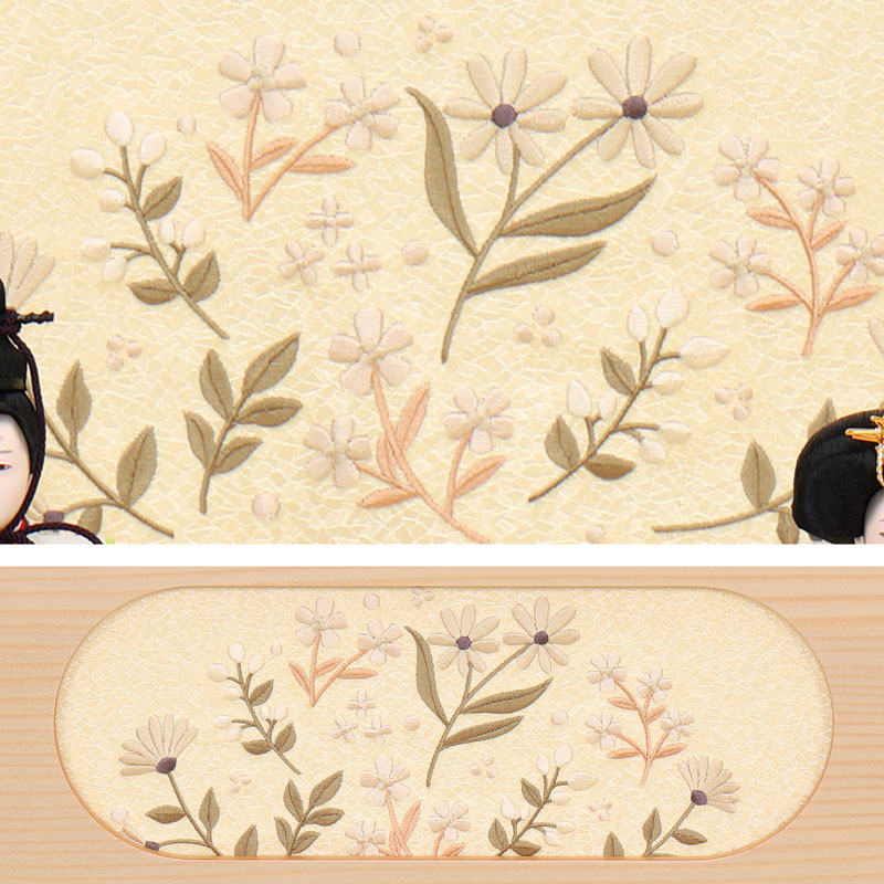 ナチュラルな印象の飾り台屏風には、近年人気のくすみカラーの糸を使って草花の刺繍を施しました。