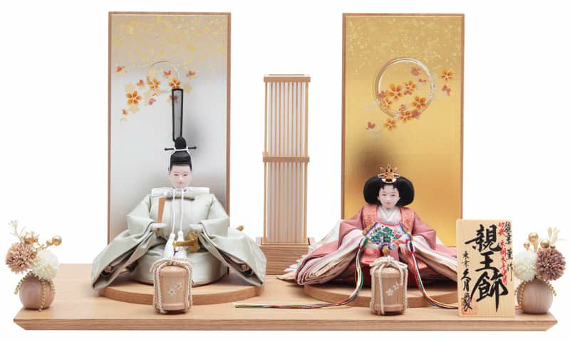 気品あふれるお顔立ちの親王は、木胴木手を用いた本格仕様。春の訪れを感じさせる爽やかな色合いの衣装は、切嵌(きりばめ)という高度な装飾技法で丁寧に仕立てられています。