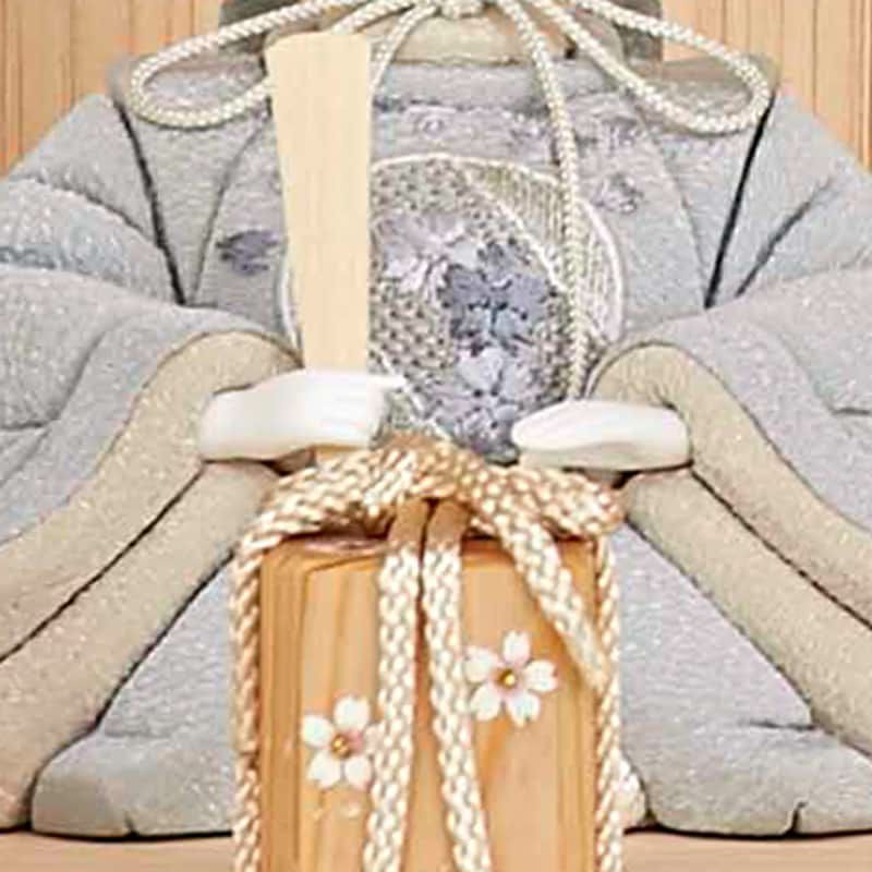 丁寧に木目込みした殿姫の衣装や行器、屏風、行燈など、随所に桜の意匠を用いた、春のお節句にふさわしい木目込み飾りです。