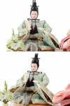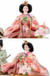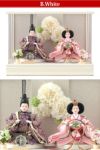 淡雪のような清楚なカラーのケースに、ネイビーと桃色の衣装を着せ付けたお雛様です。背景のフラワーリースは白とグリーンで品よく爽やかにまとめあげ、お部屋を明るく彩ってくれます。