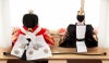 優しい微笑みを浮かべるお殿様とお姫様には、桜の刺繍を施した気品あふれる衣裳を着せ付けました。