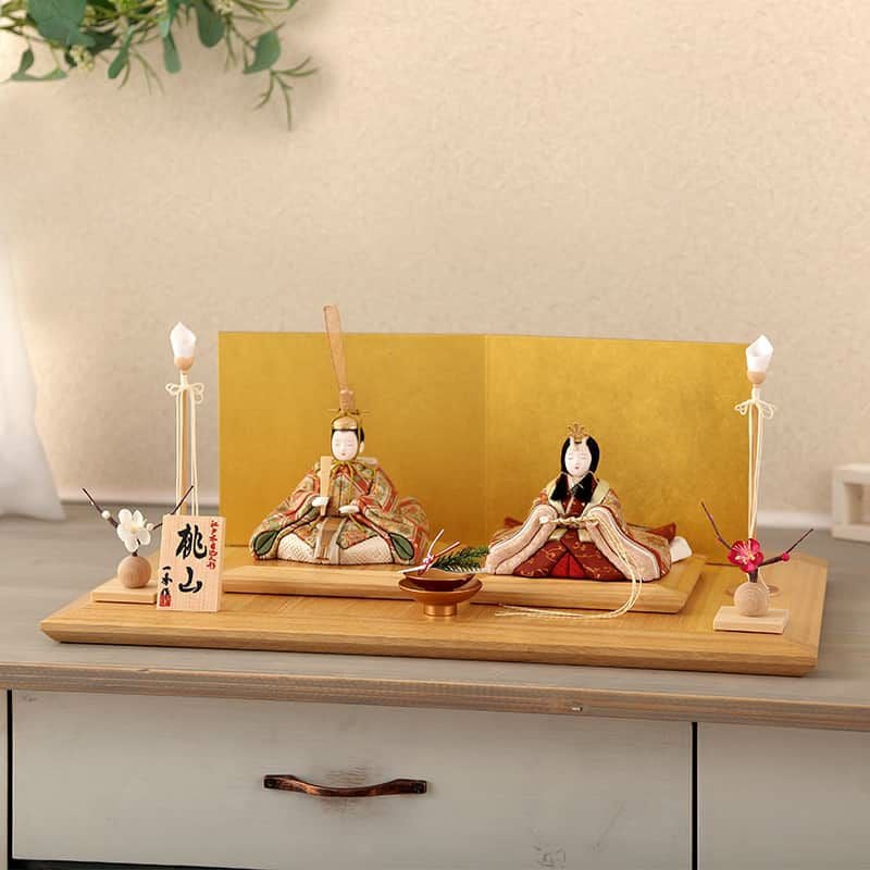 木目の美しさを存分に生かし仕立てられた白木の飾り台には、つやを抑え上品に輝く金色の屏風を合わせました。