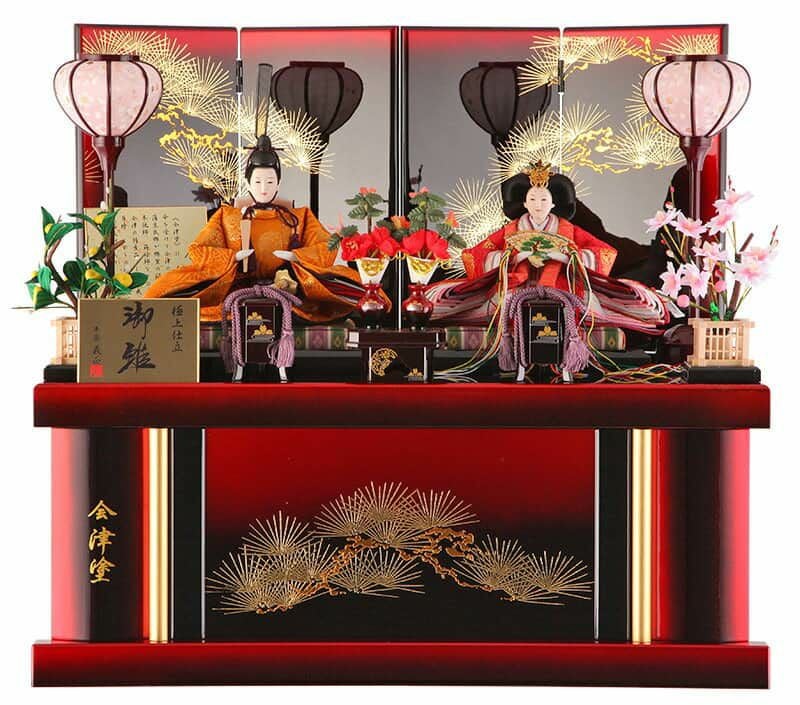 つややかな会津塗の赤溜塗で塗り上げられた台屏風には、不老長寿の意味で知られる松の蒔絵をあしらい、お子様の健やかな将来への願いを込めております。