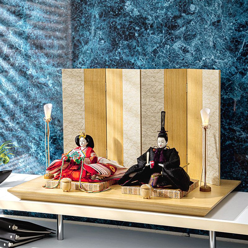 伝統的な配色のお人形とは対象的に、現代のインテリアにも馴染む白木仕立ての飾り台には、和紙仕立ての屏風を合わせました。お道具は貝桶と小さな油灯のみですが、左右の油灯は、すっきりとした仕立てでありながら、きちんと灯りをともすことが出来る本格的な作りとなっています。