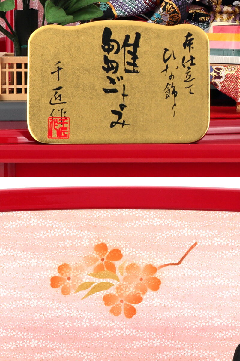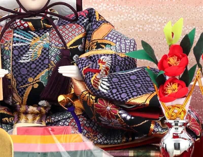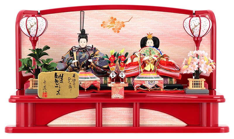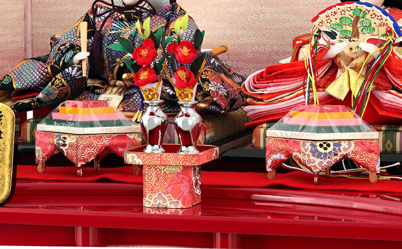 お部屋の雰囲気がぱっと華やぐような、鮮やかな色合いの飾り台が特徴的な親王飾りです。