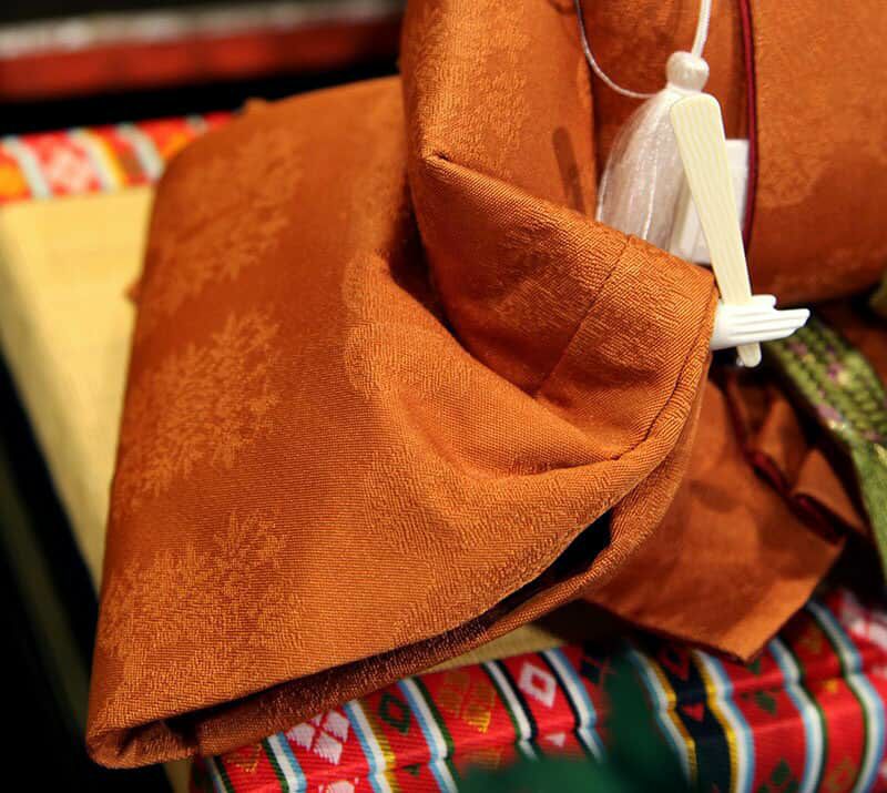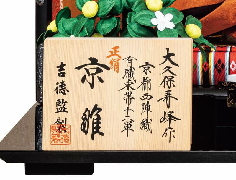 お殿様には、天皇陛下のみが着用される黄櫨染桐竹鳳凰文(こうろぜんきりたけほうおうもん)のを参考にした正絹衣装を、お姫様には雅な色合いの正絹衣装を着せ付けた本格的な装いのお雛様です。