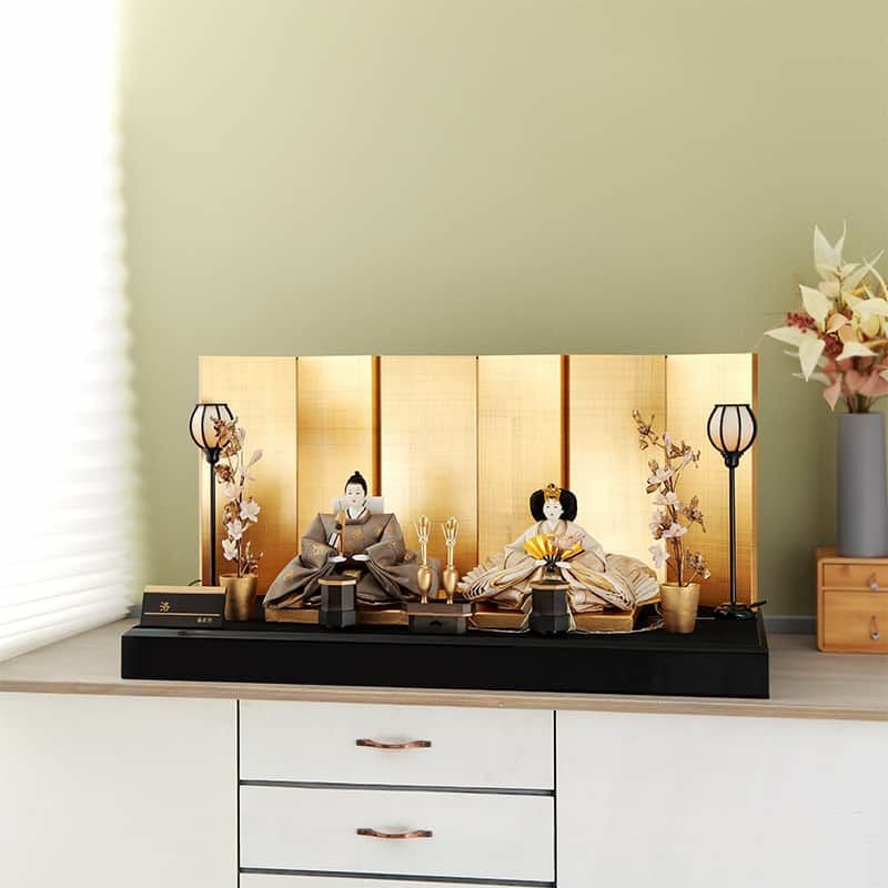 金屏風に黒の飾り台という伝統的な配色の中にも、洗練されたデザインセンスが光る親王飾りの登場です。