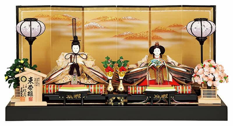 黒塗りの飾り台には、金銀砂子をあしらって美しい山々を描いた古典美あふれる屏風を合わせ、格調高い仕上がりとなっております。