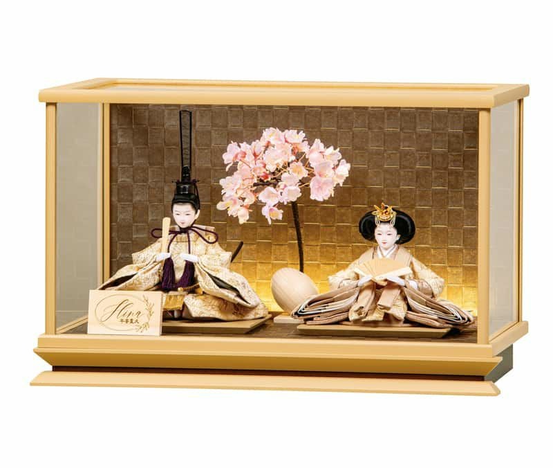 あたたかみのあるベージュカラーのケースに、可愛らしいお顔のお人形を配しました。全体の雰囲気と色調を合わせたお揃い衣装には、伝統文様としても知られる紗綾形の地紋があしらわれ、吉祥の趣あふれる仕上がりに。