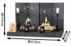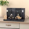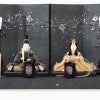 一秀の手がかけるお雛様の中では珍しい暗色を基調に仕立てた飾り台屏風は、伝統的な手漉き和紙を用いて仕立てました。きらきら輝く色箔は星空を思わせるかのようで、幻想的な雰囲気に仕上がっています。