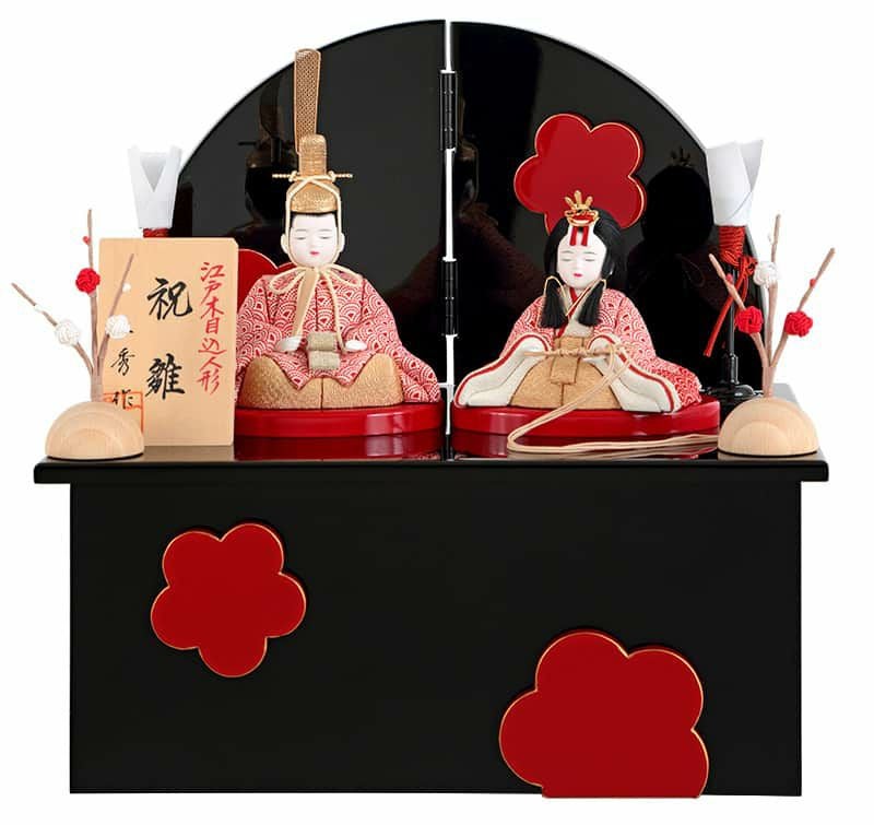 半円状に仕立てた屏風や飾り台には、春の訪れ告げる梅の花の意匠が大胆に用いられ、吉祥の趣あふれる仕上がりに。