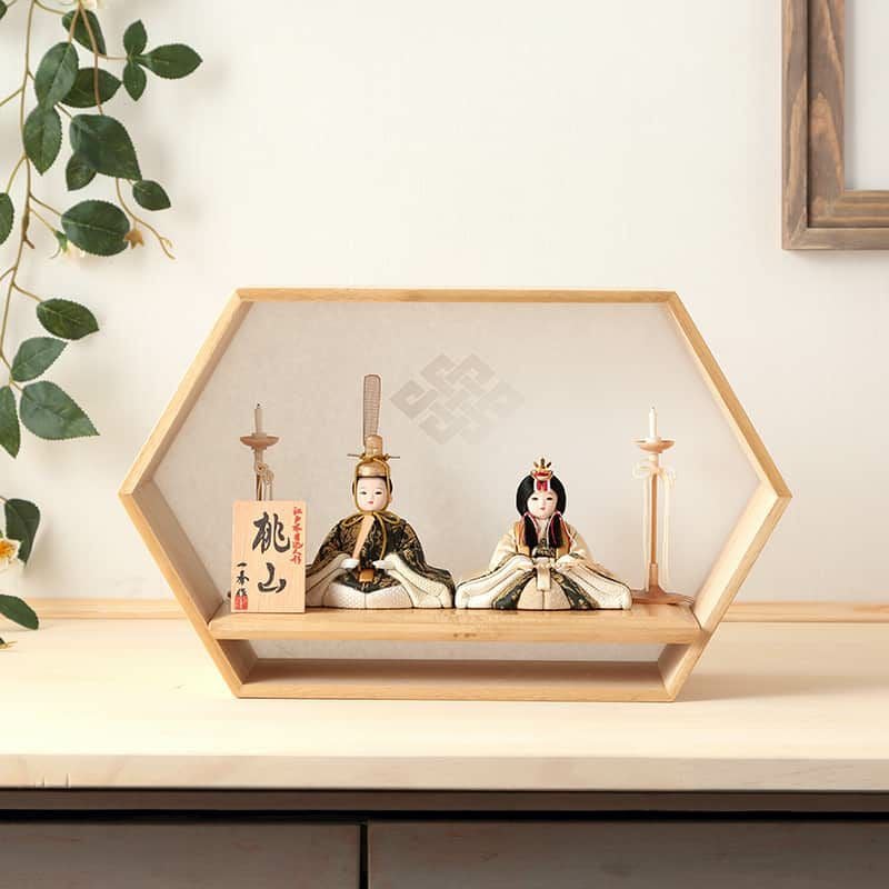 六角形をかたどった桐製の飾り台背面には、繁栄、長寿、多幸などを願う吉祥紋である角宝結び文を配しました。背面は白色の半透明素材となっており、後ろからの光がうっすらと透過する幻想的な仕立てに。左右に飾られた燭台も相まって、まるでずっと昔、ロウソクを灯していた時代を再現しているかのようです。