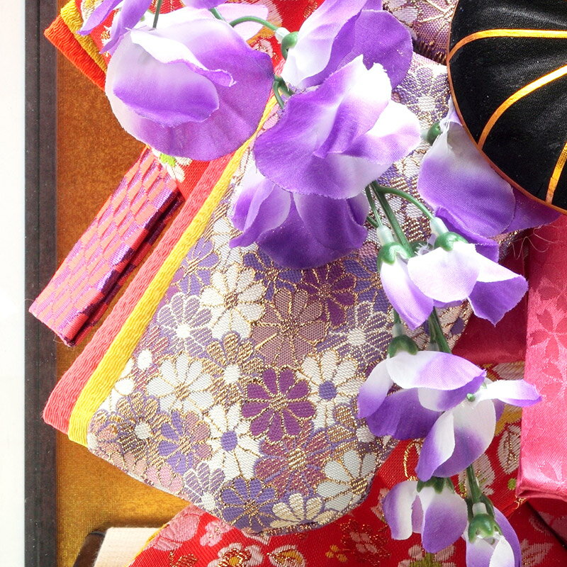 日本武踊や歌舞伎の演目の一幕「藤娘」を題材に仕立てた浮世人形です。