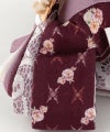 ワインレッドと白のバイカラーで仕立てた衣裳には繊細な花柄が描かれ、はっきりとした色目が目をひきますね。