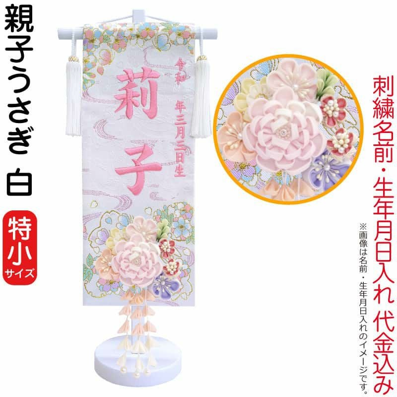 【送料無料】最安値に挑戦!2026年度新作 雛人形 雛人形 ひな人形 名前旗 女の子 親子うさぎ 白(特小)プラムピンク刺繍 生年月日 名前入代込 つまみかんざし付 白塗スタンド付 【2026年度新作】 3ad-oyakou-w