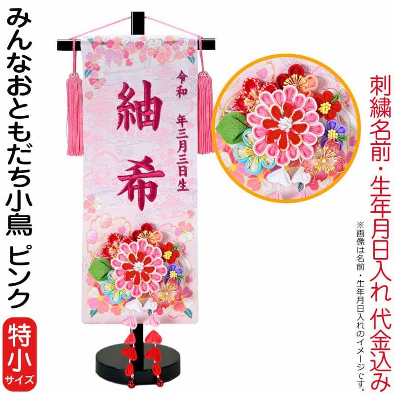 【送料無料】最安値に挑戦!2026年度新作 雛人形 雛人形 ひな人形 名前旗 女の子 みんなおともだち小鳥 ピンク(特小)ローズワイン刺繍 生年月日 名前入代込 つまみかんざし付 【2026年度新作】 3ad-tomo-p