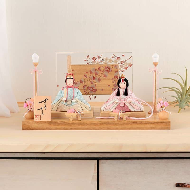 アクリルと木製板をあわせた衝立には桜の枝花が品よく描かれ、春の雰囲気満点のお雛様となりました。間口35センチとコンパクトなサイズですので、二人目のお子様にもおすすめです。