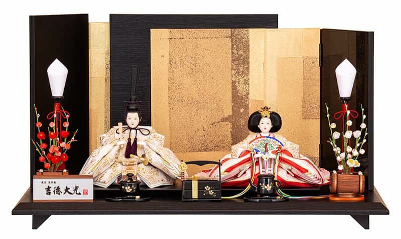 明るい金に暗い金と、様々な金色を用いて仕立てられた変形三曲屏風が、黒い木目の飾り台によく映え、お人形の衣裳との調和も見どころです。
