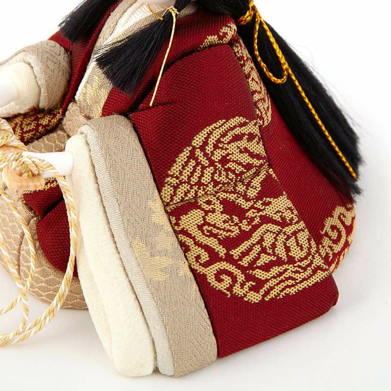 木目込み人形の魅力でもある、穏やかなお顔に合わせた衣装は高級感のある正絹帯地仕立て。