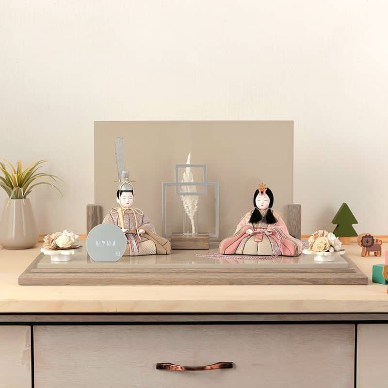 防湿防虫性に優れた桐製の飾り台には、富山県の伝統工芸でもある高岡塗をあしらったシンプルな衝立を合わせました。グレイッシュトーンでまとめられた洗練されたデザインと、お人形中央に配された独創的なお飾りがうまく調和しています。
