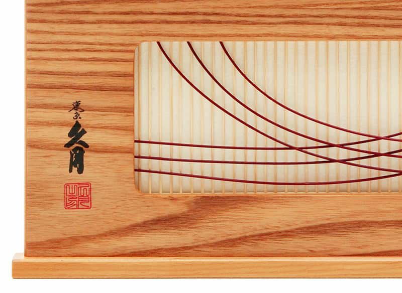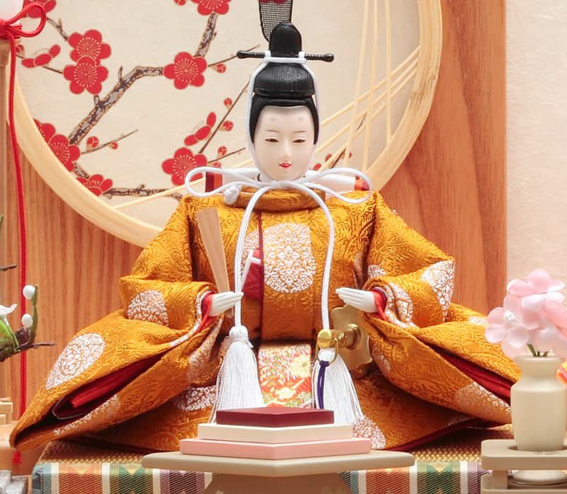 お人形が引き立つよう彩色を抑えた飾り台や屏風には、おめでたい梅のモチーフや繊細な竹細工で装飾がなされ、春らしい優しい雰囲気に仕上がっています。