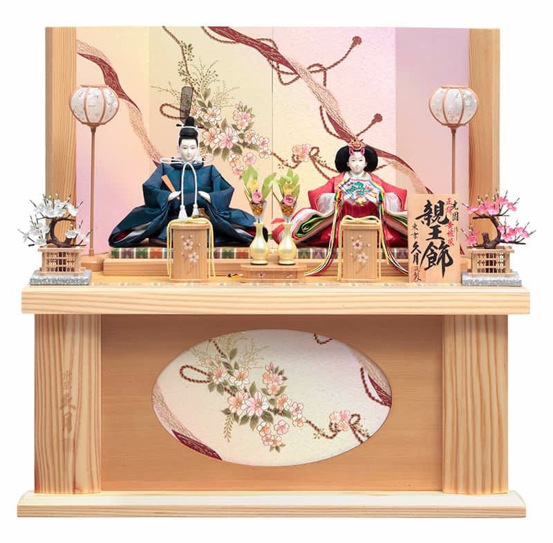 清潔感があり凛々しいお姿の親王を、木目の美しい素材感を活かして仕上げられたお道具、収納飾り台や屏風がひきたてます。