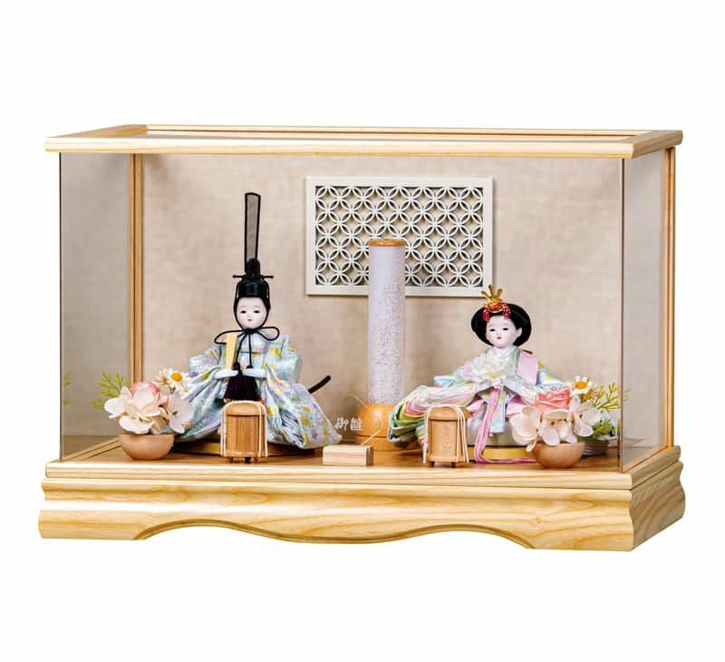 素材感をいかして仕立てた白木製のケースは、土台部分がアーチ状に形成されており、デザイン性あふれるれる仕上がりに。背景にあしらわれた七宝文様のお飾りや、ブーケのような仕立てのお花飾りなど、細部にまでこだわって作られたお雛様となっております。
