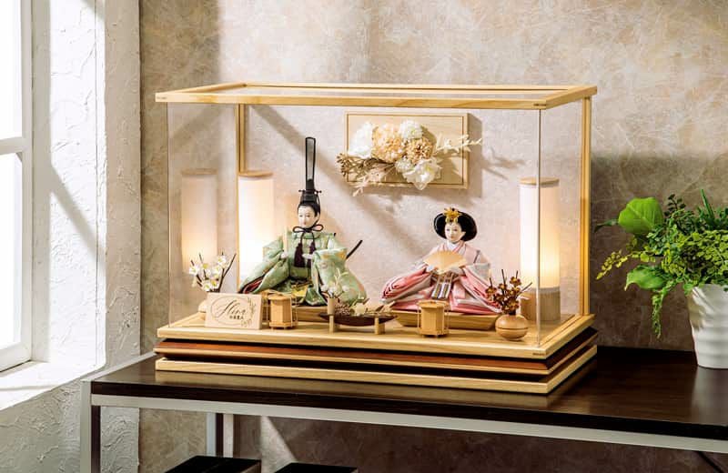 前面に柱のないパノラマタイプのアクリルケースは、近年人気のナチュラルカラー仕上げ。円柱型の雪洞や前飾りなども木目調で揃え、背景にあしらわれたアートフラワーの意匠も、おしゃれな雰囲気をより一層引き立てています。