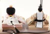 優しい微笑みを浮かべるお殿様とお姫様には、桜が満開に咲き誇る共柄の衣装を丁寧に着せ付けました。