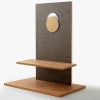 高さのあるおおきな衝立には、吉祥文様としても知られる七宝文様があしらわれた円形の金属板を配しました。