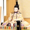 入れ目仕立ての動きのある表情が魅力のお人形に、あたたかな陽の光を思わせる色合いの衣装を丁寧に木目込みました。ふっくらとしたまあるいお顔も、華やかで気品あふれる仕上がりです。